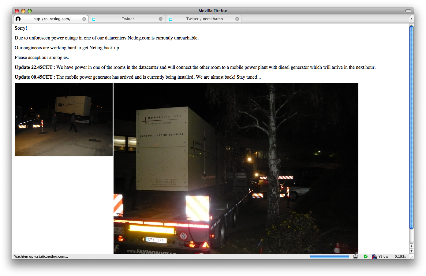 Long story short: LCL couldn't bring the power back up fast enough so we rented our own generator. After rushing to Brussels we ( The Netlog ITS-team) could sit in the offices upstairs. But after a while they had to close it down but we could stay in a room nearby (without furniture). After that we went to Steven's appartment in Machelen. We worked about 30 hours in a row, getting our sites back up and running (mostly fixing corrupted databases). Our friends from the devteam also did some great achievements the next day, by using the redundancy of denormalized database layouts they could restore nearly all missing content that had vanished because of table repairs.