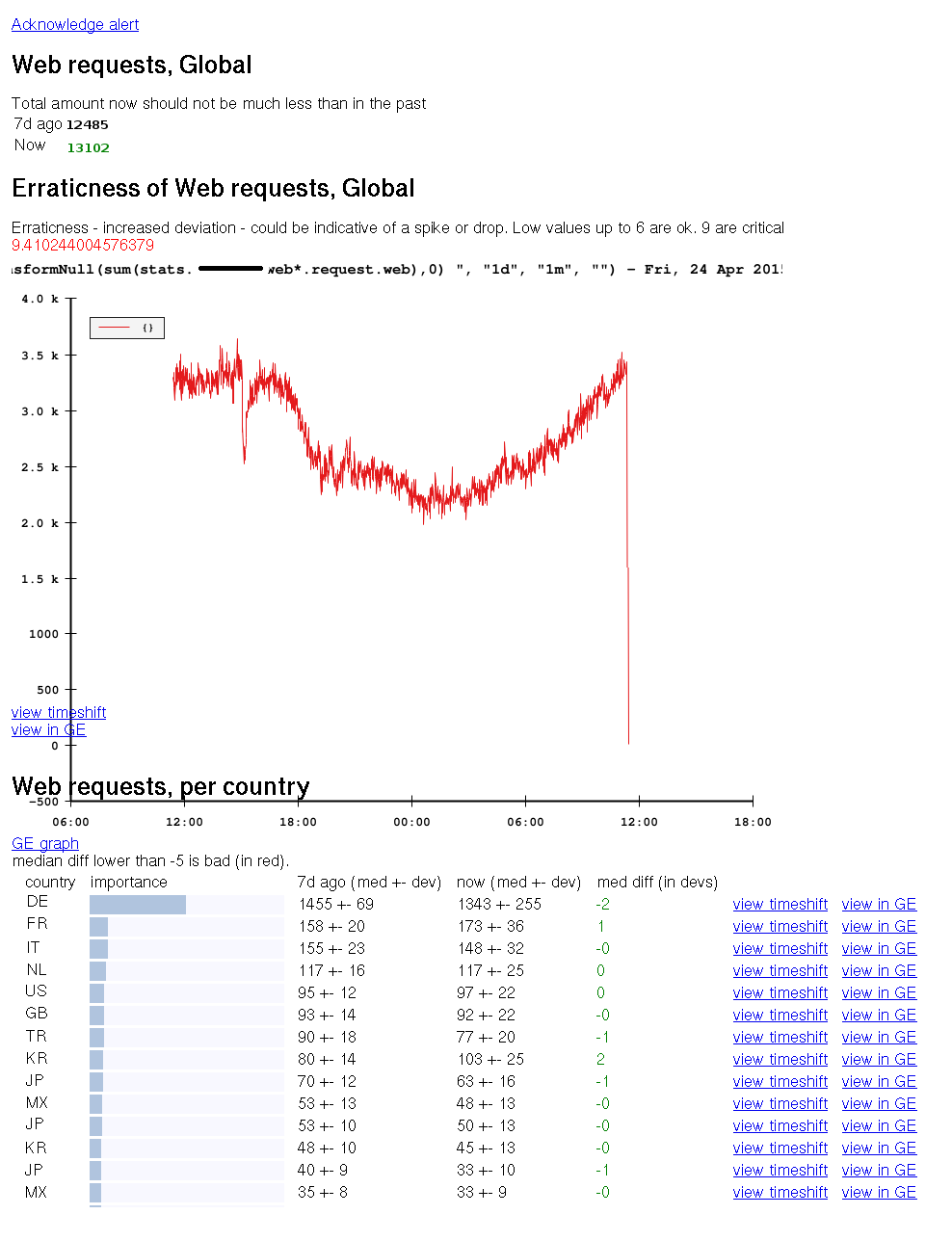 - Global volume: comparing the median value of the last 60 minutes or so against the corresponding 60 minutes last week and expressing it as a "strength ratio". Anything below a given threshold such as 0.8 is alerted on