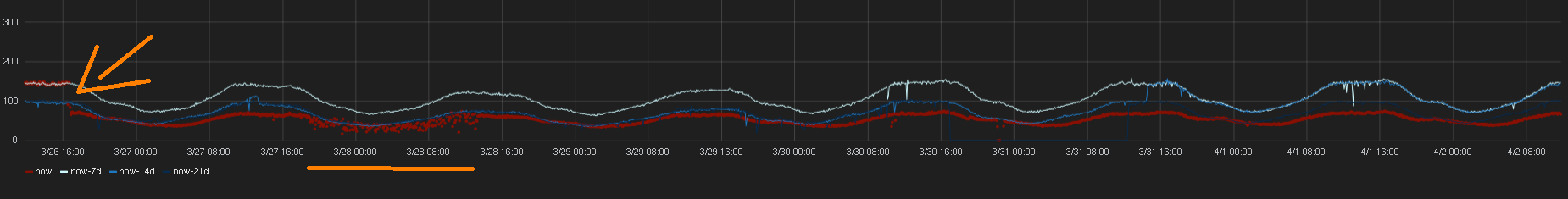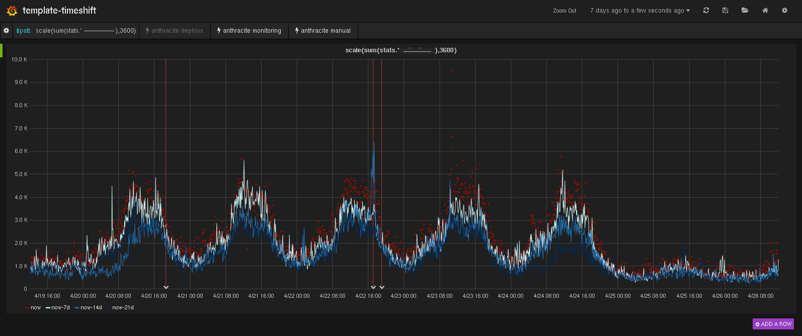 http://grafana/#/dashboard/db/templatetimeshift?var-patt=expressionIt shows the current past week as red dots, and the past weeks before that as timeshifts in various shades of blue representing the age of the data. (darker is older).